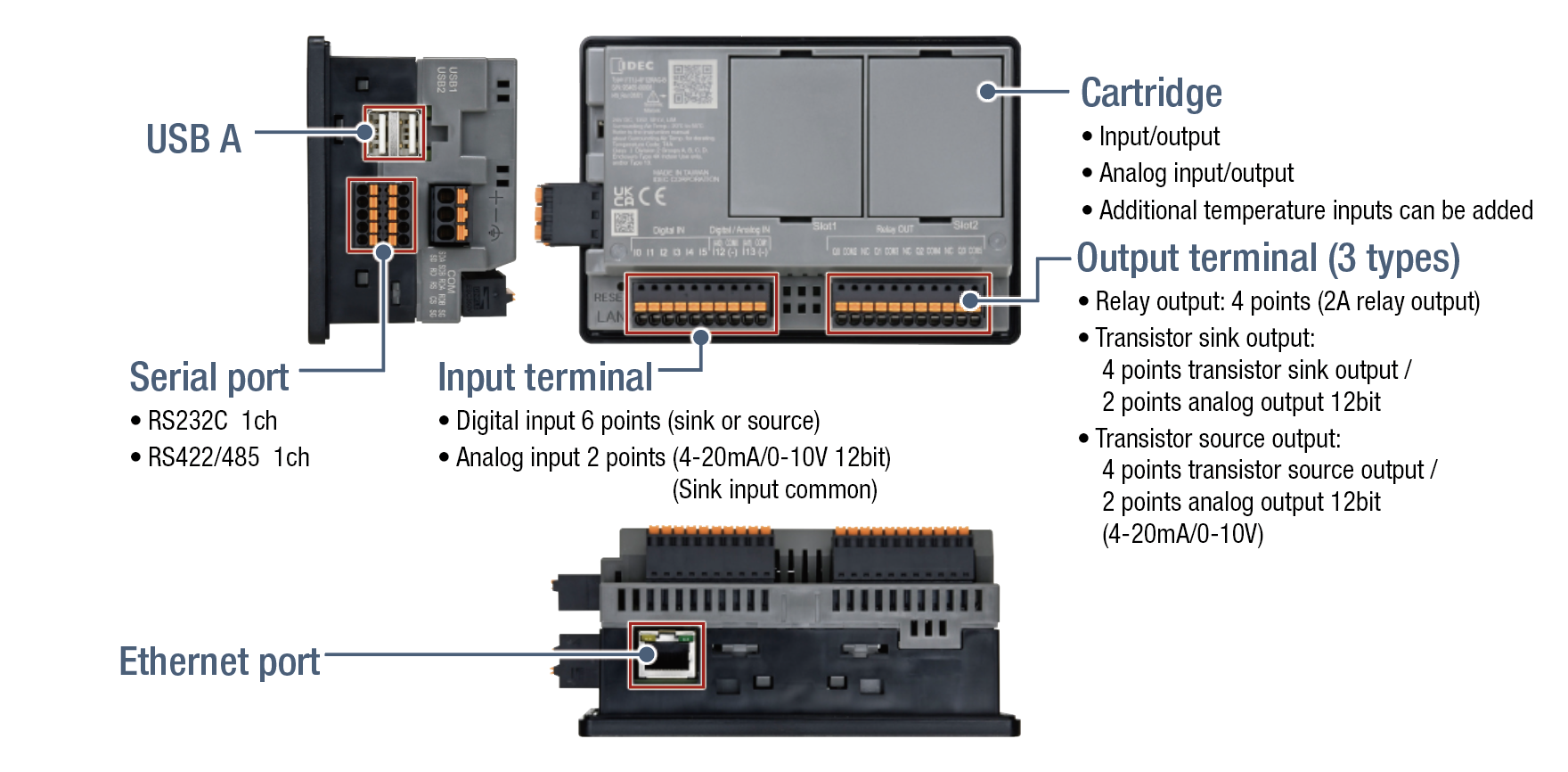 Up to 2 digital I/O cartridges or analog I/O cartridges can be connected, to add up to 8 digital I/O and up to 4 analog I/O.
