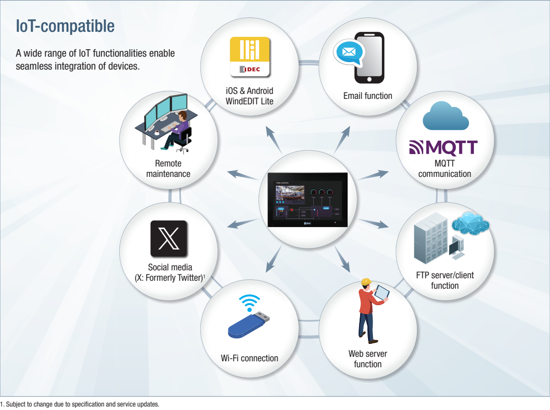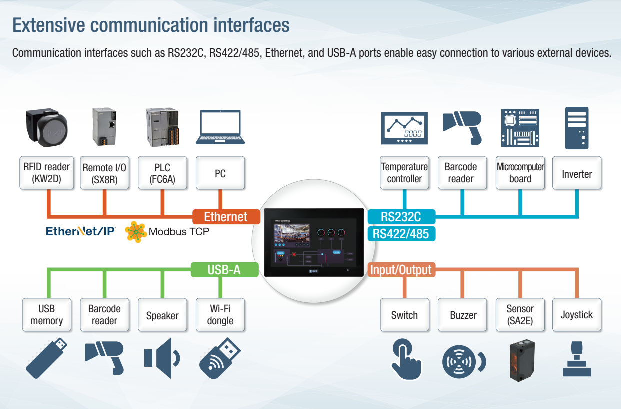 The FT1J and FT2J feature two CPUs working in parallel for the PLC and HMI. This design enables high-speed, real-time control without compromising HMI functionality, broadening the range of compatible applications.
