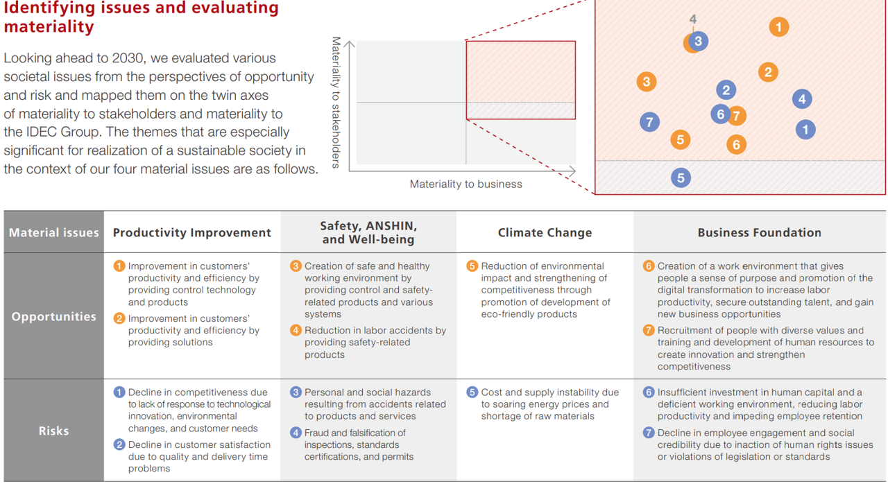 Along with formulating its long-term vision for 2050 and interim vision for 2030 in 2023, IDEC reviewed material issues, incorporating enhancement of its human capital and governance under the heading “business foundation”. IDEC again reviewed some of its material issues in light of the external environment and other factors and, in addition to adding respect for human rights in 2024, also changed its interim vision for 2030.